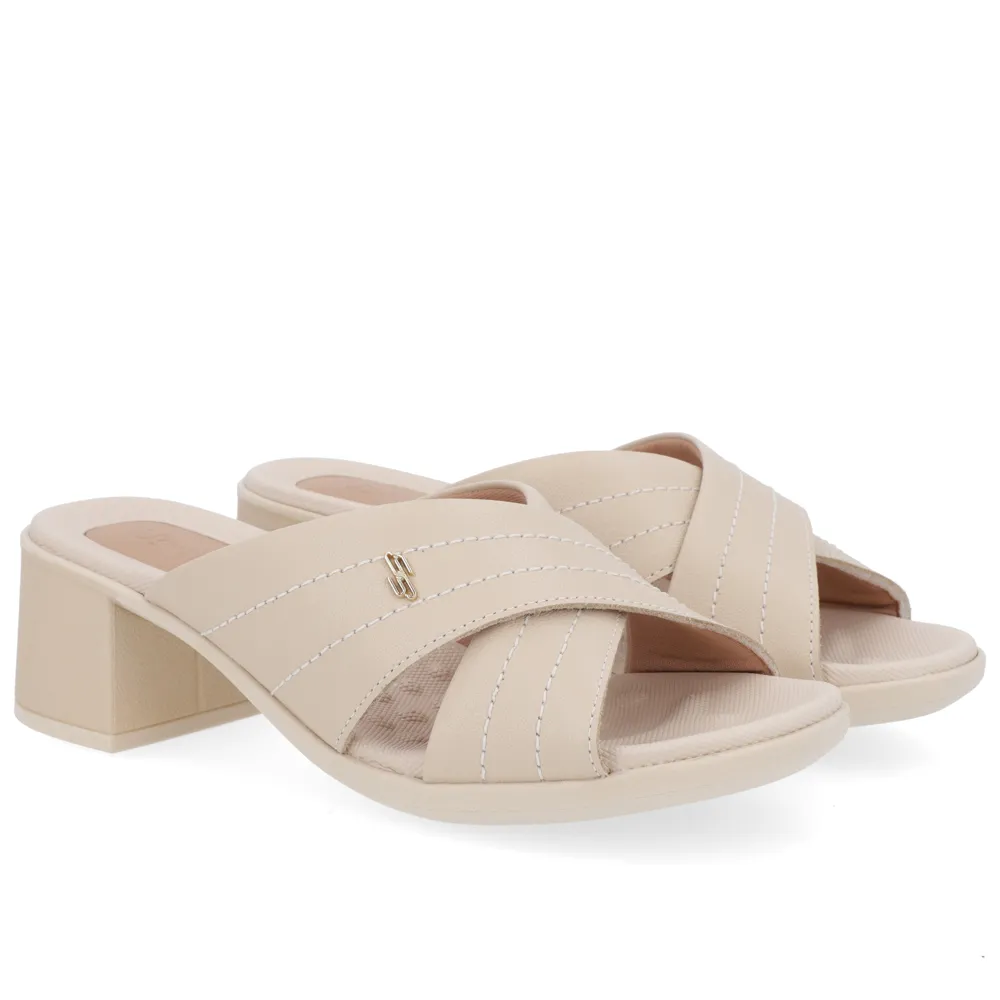 Tamanco Salto Bloco Couro Bege Tira Cruzada R$ 129,99